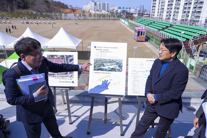 | ▲ 강기정 광주광역시장(오른 쪽)이 지난 3월 13일 오후 남구 광주국제양궁장에서 열린 '제33회 정책소풍'에 참석해 세계양궁선수권대회 준비상황 등을 점검하고 있다./광주광역시 제공 |
