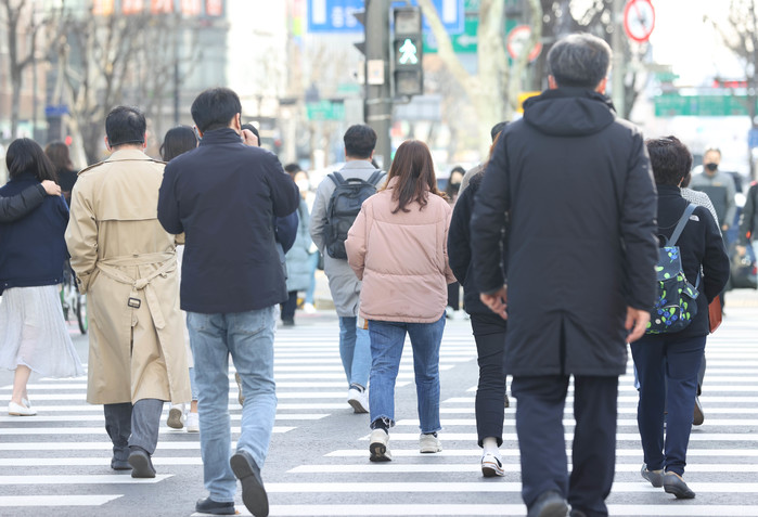 서울지역 아침 기온이 영하권으로 꽃샘추위를 보인 28일 오전 시민들이 서울 세종대로 사거리를 걷고 있다.