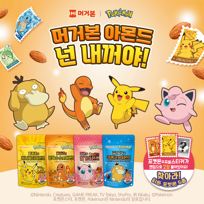 이번에 출시될 포켓몬스터 머거본 아몬드 180g 상품 패키지에는 귀여운 포켓몬 디자인을 적용하여 어린이와 포켓몬스터를 보고 자란 성인에게 재미와 추억을 선사할 예정이다.