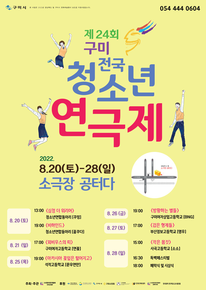 경연은 오는 20일 청소년연합동아리팀의 '심청 더 워리어', '비하인드' 공연을 시작으로 ▲21일 구미여고의 '뫼비우스의 띠' ▲25일 석적고의 '아카시아 꽃잎은 떨어지고' ▲26일 구미여자상업고의 '방황하는 별들' ▲27일 부산정보고의 '검은 형제들' ▲28일 사곡고의 '작은 몸짓'과 독백 페스티벌 순으로 진행된다.