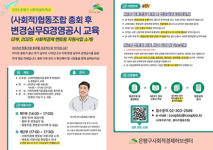 교육에서는 ▲총회 전·후 점검 사항 ▲총회 후 변경 실무 ▲협동조합 경영 공시 실습 등 실무 담당자들에게 꼭 필요한 내용을 다룰 예정이다. 교육이 끝난 후, 사회적경제기업의 경영 문제 해결과 역량 강화를 지원하는 사회적경제 멘토링 지원사업에 관해서도 소개할 예정이다.