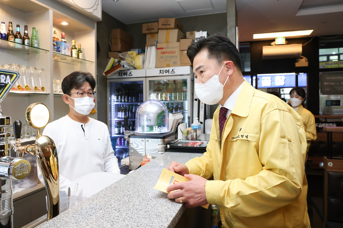 오언석 서울 도봉구청장은 지난 15일 지하철역 인근 주류 판매업소 등을 찾아 수능 전후 청소년에게 주류 판매를 금지해줄 것을 업주들에게 요청했다. 사진은 오 구청장(오른쪽)이 청소년 주류 판매 금지 등을 사전 안내하고 있는 모습. (사진제공=도봉구청)