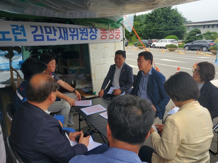 | ▲ 신정훈 민주당 전남도당위원장, 광양제철소 하청노조 농성장 방문해 노동계 의견 청취(출처=민주당 전남도당) |