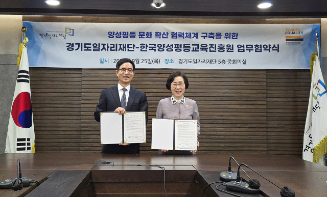 한국양성평등교육진흥원(원장 김삼화)은 경기도일자리재단(대표이사 윤덕룡)과 양성평등 문화 확산과 폭력예방 의식 제고를 위한 업무협약(MOU)을 9월 25일 체결했다고 밝혔다.