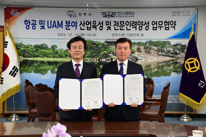 [진주=엄기동 기자] 진주시는 14일 조규일 진주시장, 김경원 경진고등학교 교장이 참석한 가운데 시청 기업인의 방에서 진주시와 경진고등학교의 ‘항공 및 UAM(도심항공모빌리티) 분야 산업육성 및 전문인력양성을 위한 업무협약’을 체결했다.