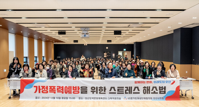 경기 오산시가 최근 오산오색문화체육센터 다목적실에서 여성단체협의회 회원을 포함한 시민 100명을 대상으로 가정폭력 예방교육을 실시했다. 사진은 교육에 참여한 이권재 시장과 관계자들이 기념 촬영을 하고 있는 모습. (사진=오산시청 제공)