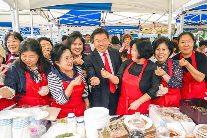 | ▲ 21일 동대문구민의 날 행사에 참여한 이필형 구청장이 주민들과 함께 사진을 촬영하고 있다.(사진=동대문구청 제공) |