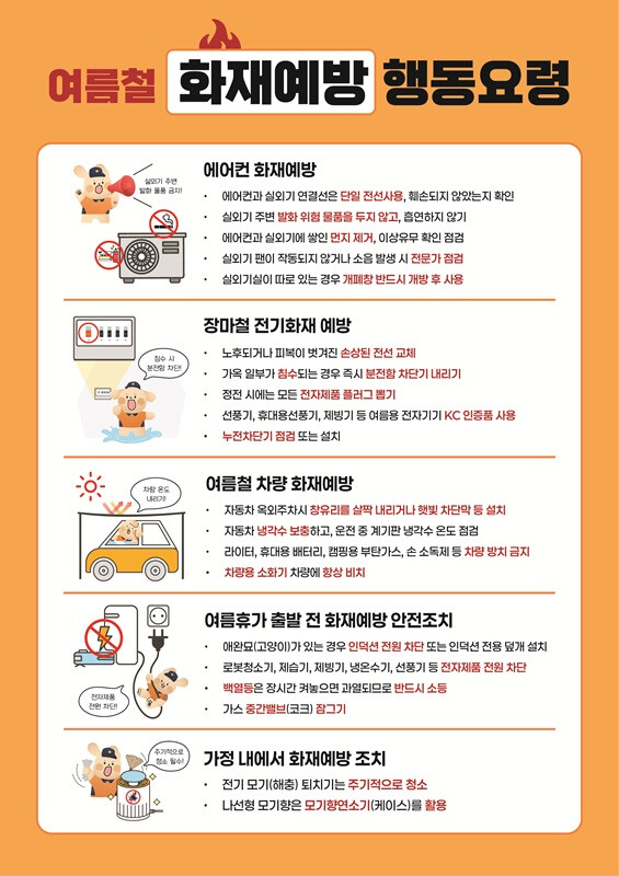 주요 행동요령으로는 ‘에어컨 전선은 단일 전선을 사용하고 손상되면 즉시 교체’, ‘실외기 주변 먼지 제거 및 가연물 두지 않기’, ‘장마철 침수 시 분전함 차단기 내리기’, ‘정전 시 전자제품 전원 뽑기’, ‘KC 인증제품 사용하기’, ‘장시간 외출 전 전자제품 전원 차단과 가스 밸브 잠그기’ 등이다.
