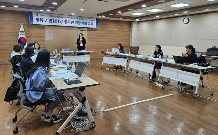 경기 수원시 영통구가 17일 구청 상황실에서 신규 임용된 민원담당 공무원 및 희망자를 대상으로 ‘주민등록통합행정시스템’ 실무 교육을 실시했다. 이번 교육은 행정안전부 주민등록실무훈련시스템을 활용해 ▲전입신고 ▲주민등록 등·초본 발급 ▲모바일 주민등록증 처리 ▲인감증명서 발급 등 주요 전산처리 절차에 대한 집중 실습 위주로 진행됐다. 사진은 교육이 진행 중인 모습. (사진=영통구청 제공)