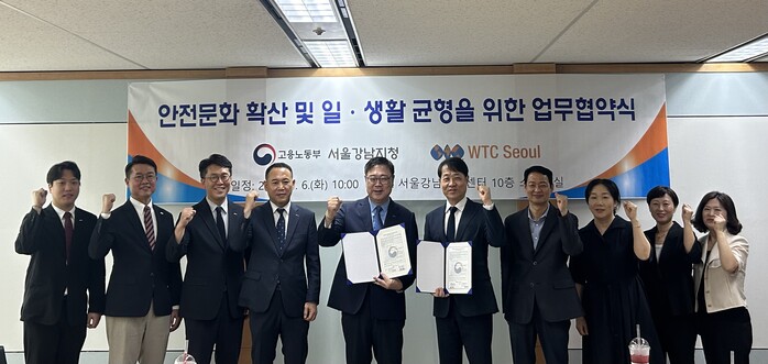 [시민일보 = 이대우 기자] 고용노동부 서울강남지청(지청장 양승준)과 (주)더블유티씨서울(대표이사 김병유)은 지난 6일 ‘안전문화 확산 및 일·생활 균형 등 고용노동정책 홍보’를 위한 업무협약을 체결했다.