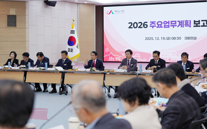 충남 서산시가 최근 시청 대회의실에서 이완섭 시장을 비롯한 공직자 70여명이 참석한 가운데 내년도 주요업무계획 보고회를 개최했다. 참석자들은 올해 각 부서에서 추진한 시책 현황과 성과 등을 공유하고 내년도 역점사업 104건과 주요 업무 567건에 대해 논의하는 시간을 보냈다. 사진은 이 시장(왼쪽 다섯 번째)이 발언하고 있는 모습. (사진=서산시청 제공)