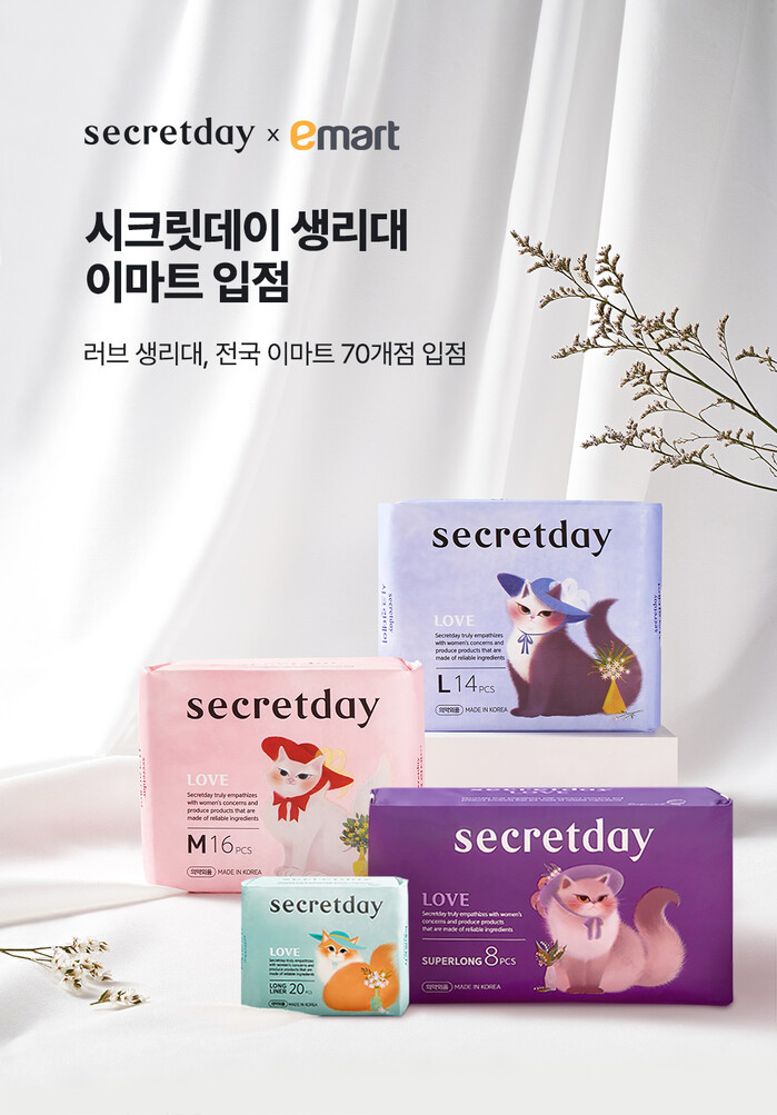 여성용품 전문 브랜드 시크릿데이가 베스트 라인인 러브 생리대를 이마트 전국 주요 70개점에 입점했다. 상품은 러브 롱라이너, 중형, 대형, 슈퍼롱 총 4종으로 구성되며, 입점 기념 할인가에 구매 가능하다.