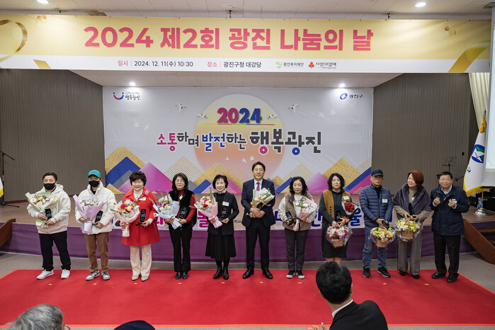 서울 광진구가 지난 11일 구청 안팎에서 오전 10시부터 6시간 동안 광진복지재단과 서울시 사회복지공동모금회 공동 주관으로 ‘제2회 광진 나눔의 날’ 행사를 개최했다. 올해 두 번째인 ‘광진 나눔의 날’은 지역내 이웃돕기 우수 기부자에게 감사의 마음을 전하고 나눔문화 확산에 기여하기 위해 ‘2025 희망온돌 따뜻한 겨울나기’와 연계해 주민참여 기부의 장을 마련했다. 사진은 김경호 구청장(맨 오른쪽)이 우수기부자들과 기념촬영을 하고 있는 모습. (사진=광진구청 제공)