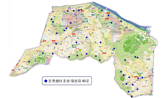 구에 따르면 ‘포켓쉼터’ 최종 대상지는 ▲주민 자발적 휴식 공간 리모델링 쉼터 1곳 ▲맨발흙길 연계 쉼터 14곳 ▲공원, 녹지대 내 공간 활용 쉼터 12곳 ▲산림 내 수림이 울창한 힐링쉼터 3곳 ▲기존 노후 휴식처 재정비 쉼터 10곳 등 총 40곳이다.