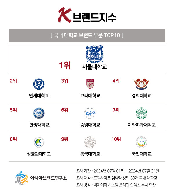 아시아브랜드연구소 한정근 대표는 “대한민국을 대표하는 K-브랜드지수 국내 대학 부문은 지난 4월에 이어 서울대·연세대·고려대 'TOP3' 체재가 유지되고 있다. 이달 9일부터 2025학년도 대학 수시모집 원서 접수가 시작되는 만큼 이번 K-브랜드지수 순위는 각 대학들의 장단점을 다각적으로 비교할 수 있는 자료로 활용 가능하다”라고 설명했다.