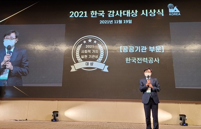 [시민일보 = 여영준 기자] 한국전력은 19일 한국감사협회가 주관하는 ‘2021 감사대상’에서 ‘사회적가치실현부문 대상’과 ‘청렴윤리부문 최우수상’을 동시에 수상했다고 19일 밝혔다.