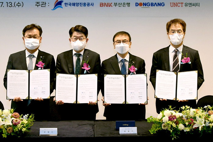 | ▲ (왼쪽부터) 부산은행 손대진 투자금융그룹장, 한국해양진흥공사 김양수 사장, ㈜동방 박창기 대표이사, 유엔씨티㈜ 김성일 대표이사가 기념촬영을 하고 있다.(사진제공=부산은행) |