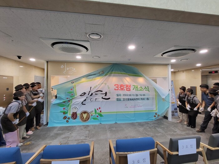 경기 김포시는 지난 12일 양촌읍에 위치한 양곡문화체육센터 지하 1층에서 실버카페 ‘인연’ 3호점 개소식을 성황리에 개최했다. 사진은 이날 제막식 행사가 진행되고 있는 모습. (사진=김포시청 제공)