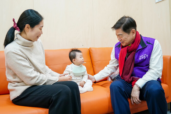 | ▲ 동대문구 아가사랑센터를 찾은 아기와 인사 나누는 이필형 동대문구청장. (사진=동대문구청 제공) |