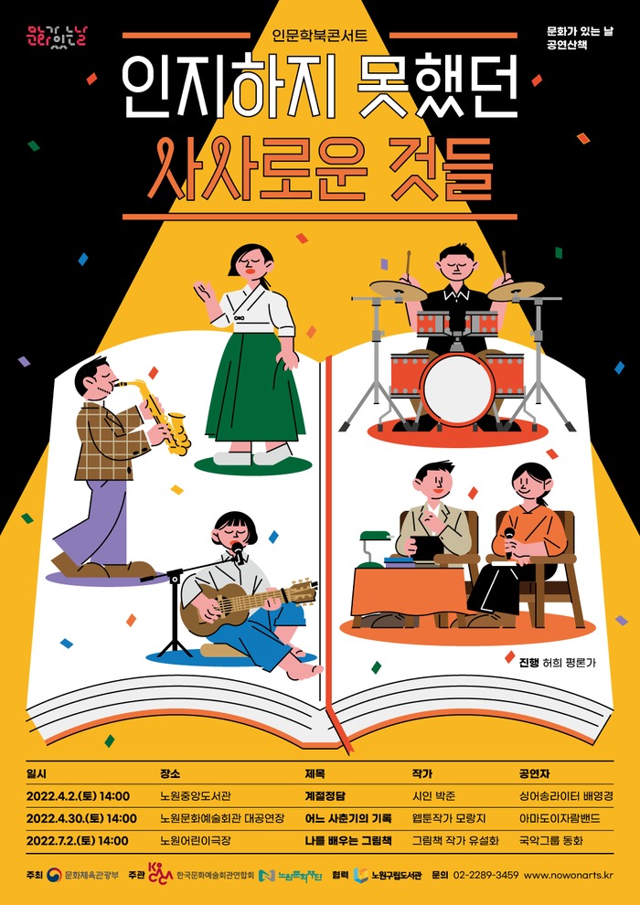 [시민일보 = 홍덕표 기자] 서울 노원구(구청장 오승록)는 이달부터 오는 10월까지 '인지하지 못했던 사사로운 것들'이라는 주제로 총 6번에 걸친 시리즈 공연으로 '2022년 인문학 북콘서트'가 열린다고 1일 밝혔다.
