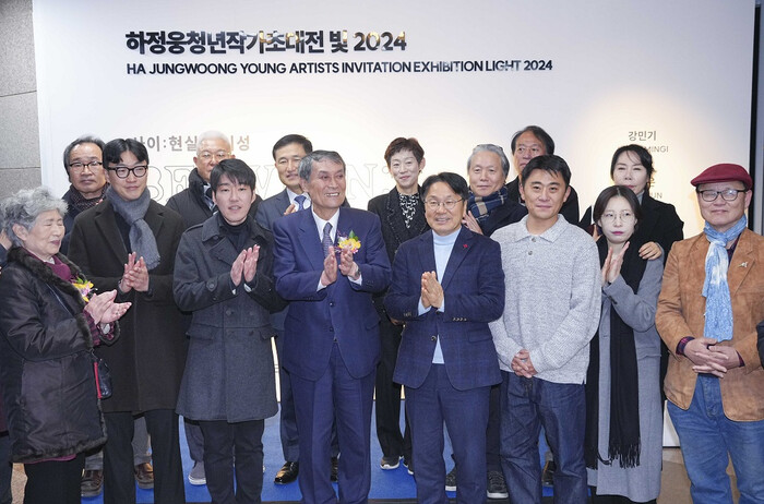 강기정 광주광역시장(앞줄 왼 쪽부터 다섯 번째)이 18일 오후 서구 광주시립미술관 분관 하정웅미술관에서 열린 '제24회 하정웅 청년 작가초대전 빛 2024'개막식에 참석해 하정웅 명예 관장, 청년작가 등과 기념촬영을 하고 있다. 전시회는 내년 2월 16일까지 열린다./광주광역시 제공