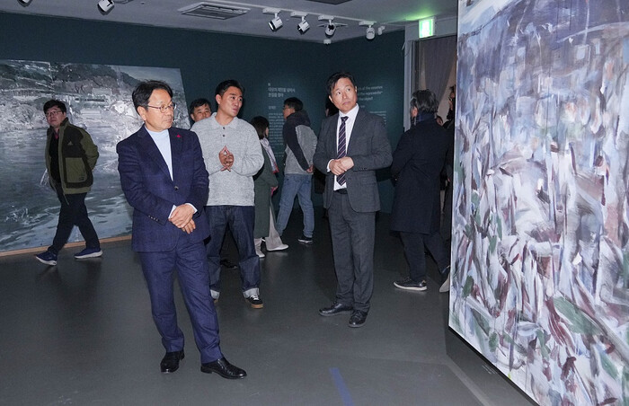 강기정 광주광역시장이 18일 오후 서구 광주시립미술관 분관 하정웅미술관에서 열린 '제24회 하정웅 청년 작가초대전 빛 2024'개막식에 참석해 작품을 관람하고 있다. 전시회는 내년 2월 16일까지 열린다./광주광역시 제공