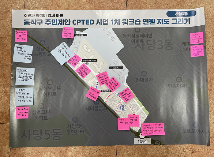 | ▲ 동작구 주민이 주민워크숍에서 아이디어를 제안하며 그린 민원 지도. (사진제공=동작구청) |