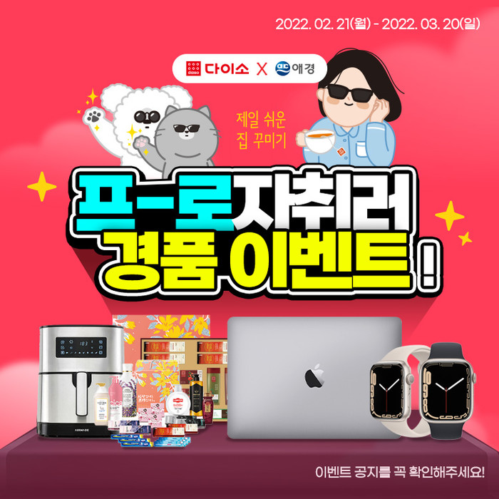 이벤트 기간 내 ‘프로자취러 애경 상품’최대 금액 구매자에게는 맥북 에어(512G), 최다 수량 구매자에게는 애플 워치 7을 증정하고, 추첨을 통해 에어 프라이어 등 다양한 경품을 제공한다. 자세한 사항은 샵다이소 앱에서 확인할 수 있다. 5만 원 초과 경품에 대한 제세공과금(22%)는 본인 부담이다.