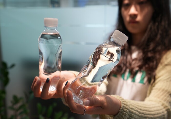 기존 라벨에 적혀 있던 제품 관련 정보는 용기 겉면 아랫부분에 먹는샘물 표기와 함께 용량 및 수원지를 투명한 양각으로 표기했다.
