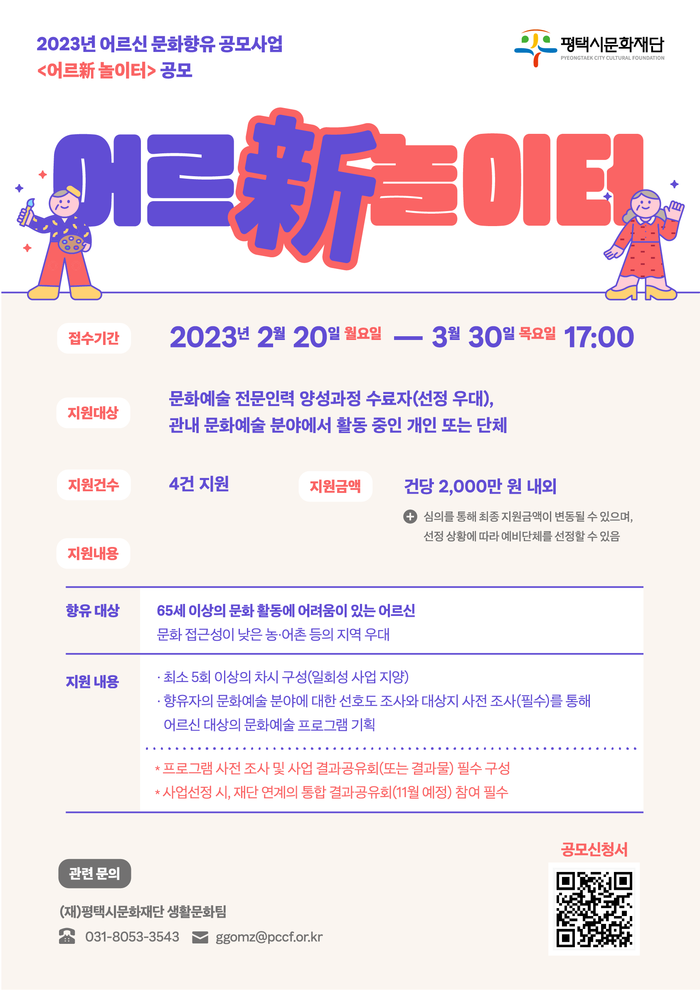 [평택=오왕석 기자] 재단법인 평택시문화재단(대표이사 이상균)은 어르신 문화향유 공모사업 <어르新 놀이터>를 오는 3월 30일까지 모집한다.