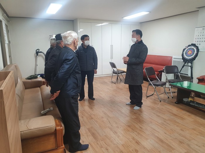 경기 광주시 곤지압읍행정복지센터는 위드코로나로 35개 경로당 중 22개 경로당이 운영을 재개함에 따라 지난 24일부터 경로당을 방문해 개인 방역 준수 홍보와 보일러·수도 등 시설 점검 및 운영 상태를 확인했다. 사진은 읍 관계자가 경로당을 방문해 노인들과 대화를 나누고 있는 모습. (사진제공=광주시청)