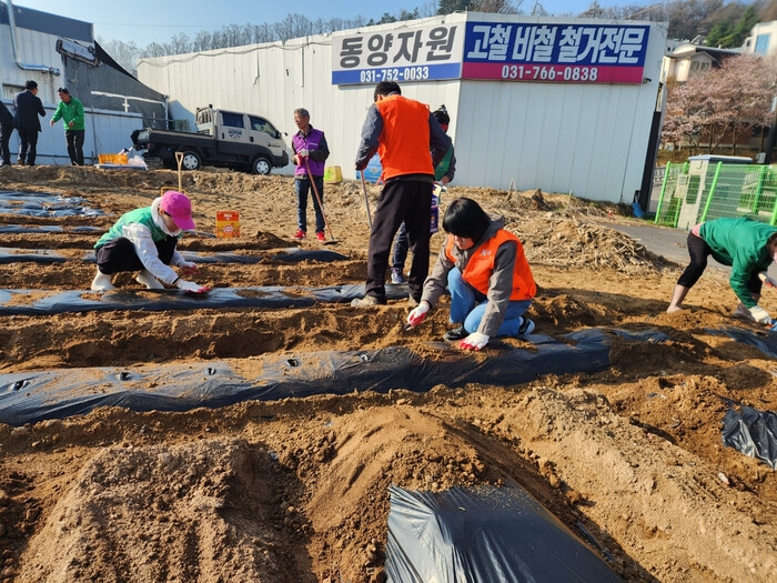 경기 광주시 능평동 새마을 남녀지도자협의회가 최근 능평동 175-8 일원 텃밭에서 ‘사랑의 감자 심기’ 행사를 성공적으로 마무리했다. 이번 행사는 지역 농업 활성화는 물론, 수확된 감자를 소외계층에게 전달해 따뜻한 나눔을 실천하기 위한 목적으로 마련됐다. 사진은 행사 참여자들이 감자를 심고 있는 모습. (사진=광주시청 제공)