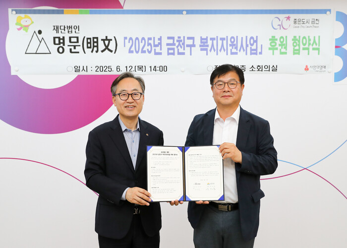 [시민일보 = 여영준 기자] 금천구(구청장 유성훈)는 최근 구청 소회의실에서 재단법인 명문(明文)과 2025년 금천구 복지지원사업을 위한 협약식을 진행했다고 밝혔다.