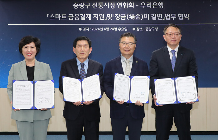 우리은행은 지난 24일 △우리은행 중소기업그룹 정진완 부행장 △우리은행 금융소비자보호그룹 정현옥 부행장 △중랑구청 류경기 구청장 △중랑구 전통시장 연합회 한대섭 회장 등 여러 관계자가 참석한 가운데, 중랑구 전통시장 연합회와 ‘스마트 금융결제 지원 및 장금(場金)이 결연’ 업무협약을 체결했다고 밝혔다.