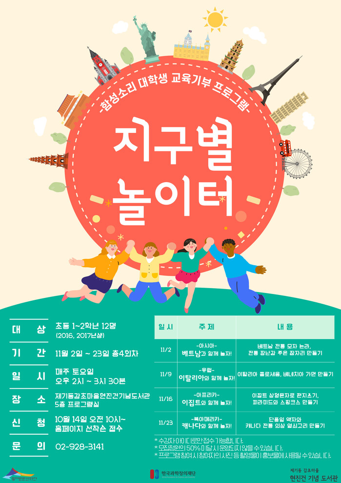 11월 2일부터 11월 23일 매주 토요일에 운영되는 이번 강좌는 초등학생 1~2학년을 대상으로 진행한다. ▲1차시(11/2) 베트남과 함께 놀자! ▲2차시(11/9) 이탈리아와 함께 놀자! ▲3차시(11/16) 이집트와 함께 놀자! ▲4차시(11/23) 캐나다와 함께 놀자! 로 구성되어 있으며 다양한 나라의 문화를 학습하고 각 나라의 전통문화와 관련된 만들기 체험으로 운영될 예정이다.