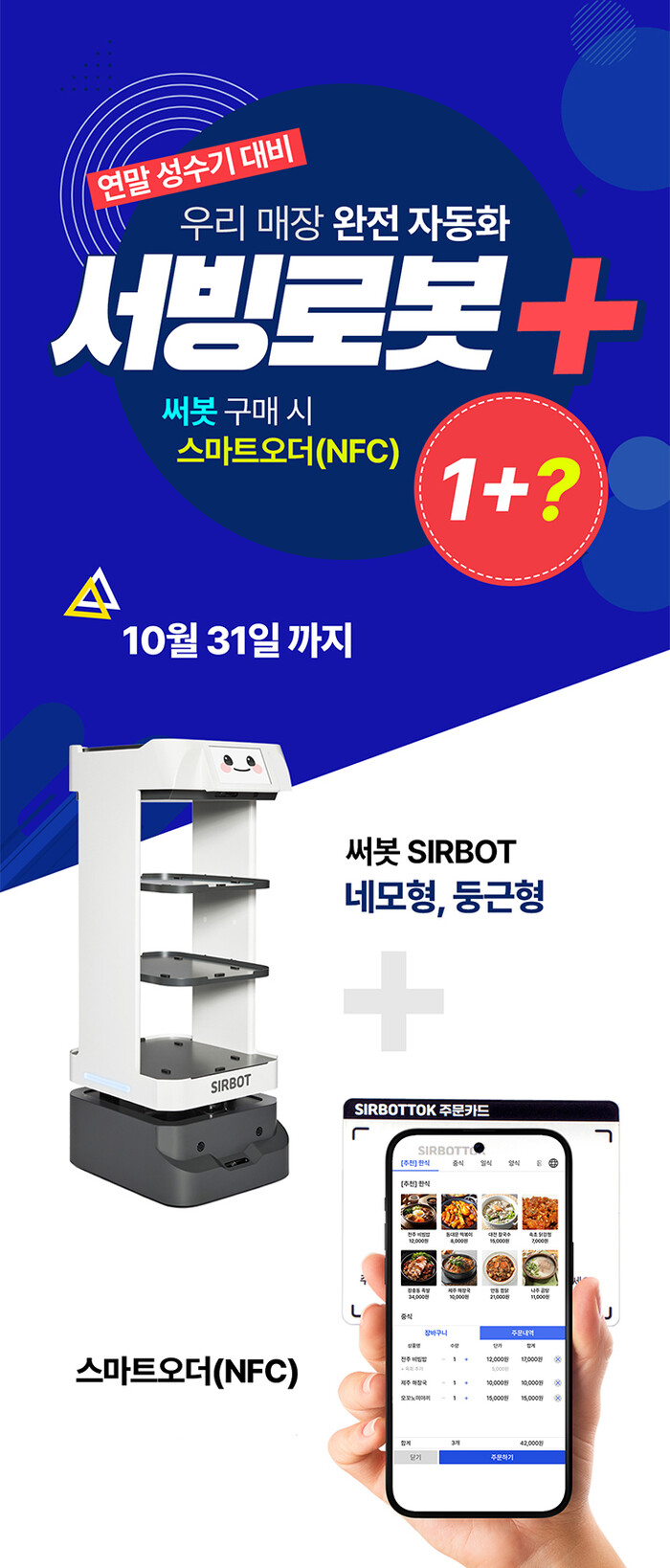 해당 프로모션은 써봇 공식 웹사이트를 통해 문의 및 상담 후 써봇을 도입하는 고객을 대상으로 진행되며, 써봇 도입 수량에 따라 NFC 스마트오더를 최대 20대까지 무상 제공한다. 서빙로봇 둥근형과 네모형 중 선택할 수 있으며, 36개월 렌탈 계약 고객에 한해 적용된다.