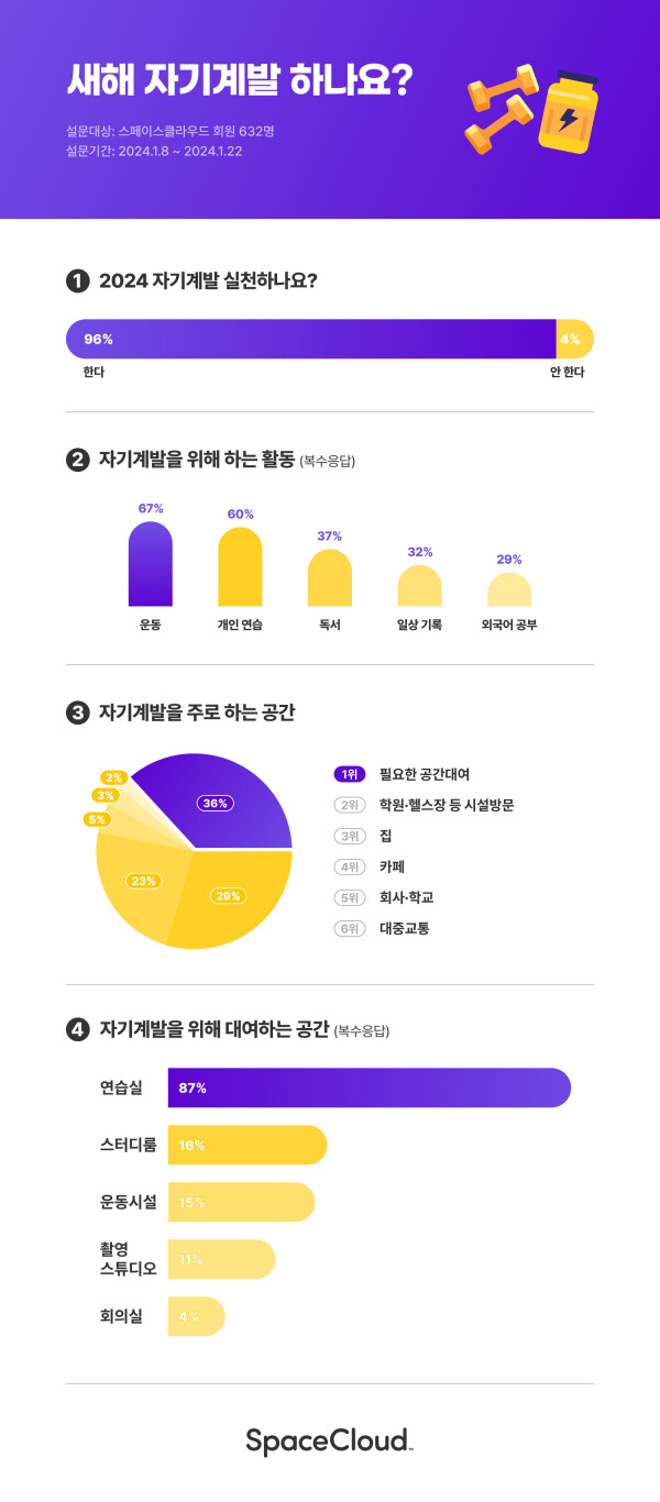 [시민일보 = 이창훈 기자] 생활공간 플랫폼 스페이스클라우드가 회원 632명을 대상으로 실시한 설문조사 결과, 응답자 96%(606명)가 새해 자기계발을 실천한다고 답했다고 2일 밝혔다.