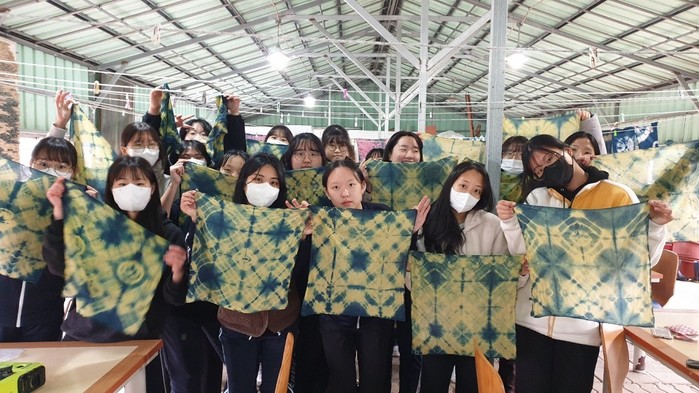 | ▲ 영암군 관내 고등학교 3학년에 재학 중인 학생들이 (사)예담은 규방문화원의 전통 천연 염색 체험활동에 나선 가운데 자신이 직접 염색한 손수건을 들고 기념촬영을 하고 있다. / 영암군 제공 |