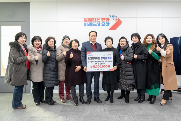 경기 오산시가 최근 (사)경기도여성단체협의회 오산시지회로부터 특기생 등 인재 육성을 위한 장학금 500만원을 기탁받았다. 사진은 기탁식에서 이권재 시장(가운데)이 관계자들이 기념 촬영을 하는 모습. (사진=오산시청 제공)