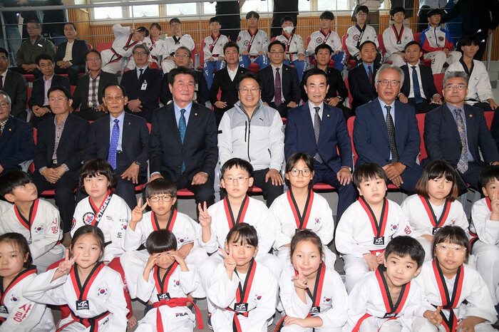 [광주=정찬남 기자] 강기정 광주광역시장이 2일 오전 빛고을체육관에서 열린 2024년도 광주광역시장배 생활체육태권도대회에 참석해 선수단을 격려하고, 참석자들과 함께 기념촬영을 하고 있다. /광주광역시 제공