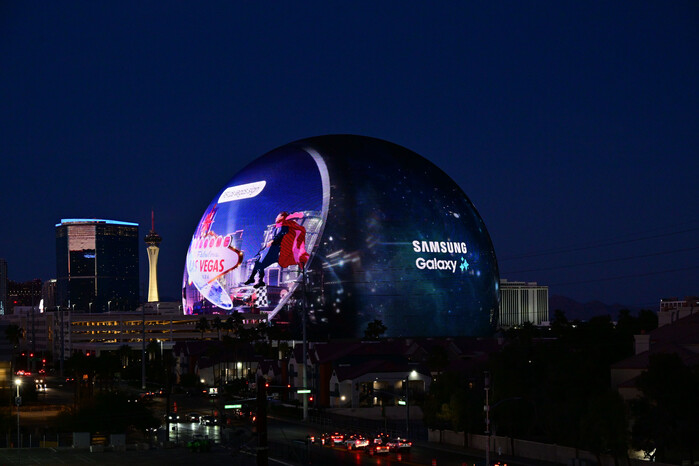 | ▲ 지난 8일 미국 라스베이거스의 랜드마크 스피어(Sphere)에서 공개된 '갤럭시 언팩' 디지털 티징 영상.(사진=삼성전자 제공) |
