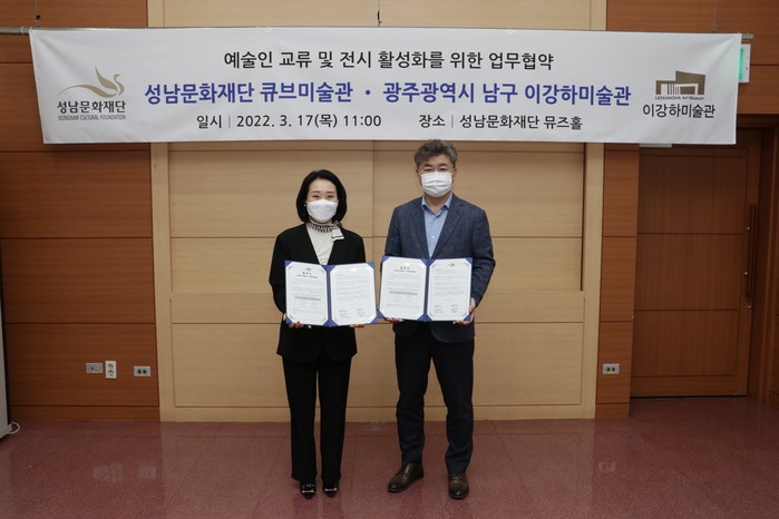 이날 협약을 통해 성남문화재단과 광주광역시 이강하미술관은 2023년까지 전시 공동 기획 및 추진, 홍보 등을 함께하고 특히 새로 조성한 성남큐브미술관 상설전시장을 활용한 교류전을 추진하기로 했다.