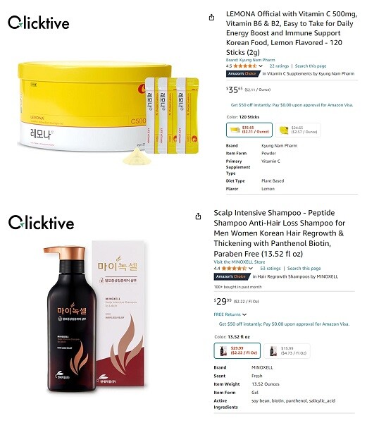 이번에 아마존 초이스를 받은 제품은 ▲두피, 모발 집중 강화 독자 성분을 바탕으로 두피 안티에이징에 특화된 현대약품(주)의 ‘마이녹셀’ ▲간편한 휴대성과 취식성을 자랑하는 딥마인드플랫폼(주)의 ‘레모나 120포’이다. 해당 브랜드의 제품은 각각 아마존 론칭4개월, 2개월이라는 단기간 내에 아마존 초이스에 선정되어 이례적이라는 평가를 받고 있다.