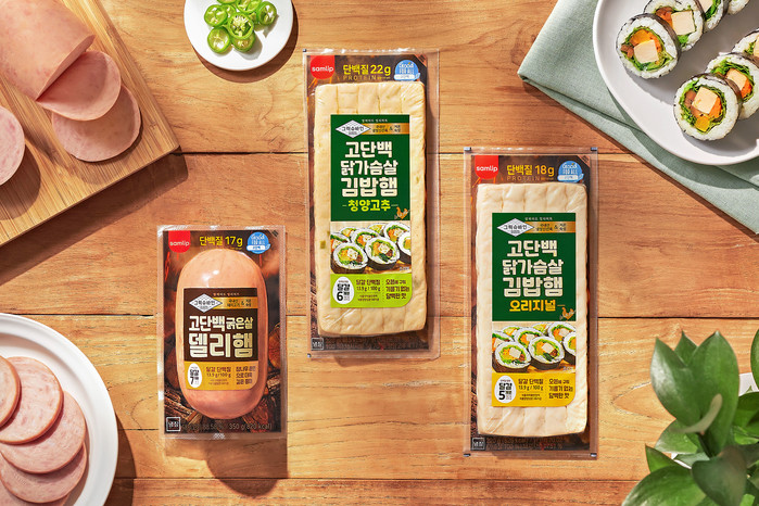 ‘고단백 닭가슴살 김밥햄(오리지널, 청양고추)’은 국내산 닭가슴살을 오븐에 구워 담백하고 촉촉하며, ‘고단백 굵은살 델리햄’은 참나무로 훈연한 국내산 돼지고기 통살을 사용해 풍부한 식감을 느낄 수 있다.