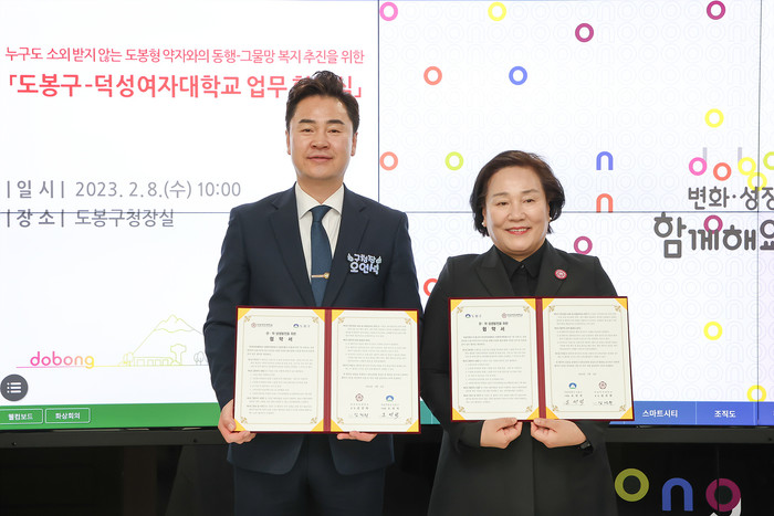 서울 도봉구가 지난 8일 덕성여자대학교와 양기관의 상호발전과 도봉구민의 복지 증진을 위한 긴밀한 협조체계 구축을 위한 협약을 체결했다. 이날 협약으로 양 기관은 도봉구민의 사회복지 증진 등을 약속했다. 사진은 협약식에서 오언석 구청장(왼쪽)과 김건희 총장이 기념촬영을 하고 있는 모습. (사진=도봉구청 제공)