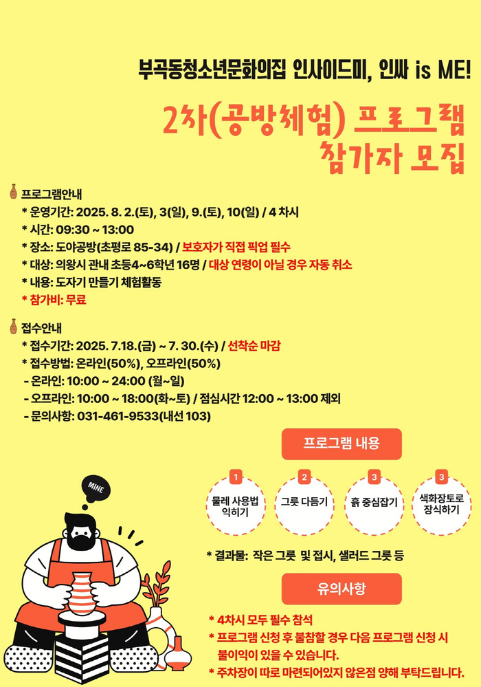 [의왕=송윤근 기자] 경기 (재)의왕시청소년재단(이사장 김성제) 산하 부곡동청소년문화의집이 2025년 지역 연계 위탁 프로그램(군포의왕교육청 협력사업 일환)‘인사이드미, 인싸 is ME!’의 2차(공방체험) 프로그램에 참여할 청소년을 모집한다고 밝혔다.