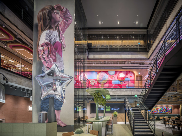 1층 쉐이크쉑 매장은 ‘팝핑! (Popping!)’을 주제로 한 그래픽 디자이너 차인철의 드로잉 작품을 통해 에너지가 넘치고 새로운 경험을 제공하는 쉐이크쉑을 표현했다.