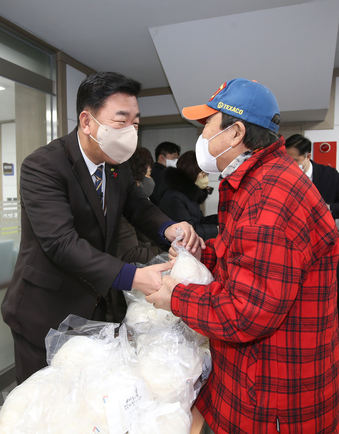 이범석 청주시장과 허경재 충청북도기업진흥원장, 청주우암교회 관계자 등이 참여한 이날 행사는 청주시 일자리종합지원센터의 새벽구직자 무료급식 지원사업과 연계해 청주 우암교회가 후원한 떡국용 떡 100개(1kg용)를 전달하는 방식으로 진행됐다.