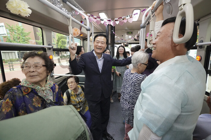 서울 성북구가 노후된 교통약자 무료셔틀버스 1대를 교체 완료했다. 교체된 버스는 휠체어 2대를 포함해 47명이 탑승할 수 있으며, 리프트 설비는 물론 안내원이 동행하는 압축천연가스(CNG) 초저상버스다. 사진은 지난 12일 신규 셔틀버스 운행 첫날 이승로 구청장(가운데)이 구민들과 함께 시승하고 있는 모습. (사진=성북구청 제공)