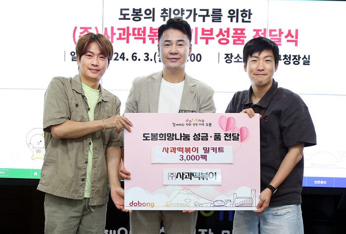 서울 도봉구가 지난 3일 (주)사과떡볶이로부터 지역내 아동·청소년을 위한 떡볶이 밀키트 3000팩(약 2100만원 상당)을 전달받았다. 후원받은 밀키트는 도봉구 푸드뱅크마켓을 통해 도봉구 지역아동센터와 청소년복지단체에 전달될 예정이다. 사진은 오언석 구청장(가운데)이 관계자들이 기념촬영을 하고 있는 모습. (사진=도봉구청 제공)